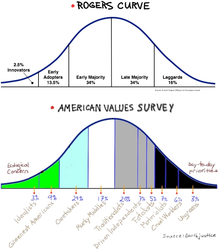 So, cleantech companies face tough choices in the US. Going to market with a price premium attracts Idealists and Greenest Americans. But these segments may be too small for a product to achieve the economies of scale needed to lower prices and win in the mass market.