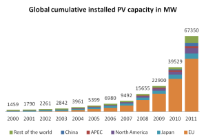 Installed solar cells. The chart shows the installed base is doubling every 2-3 years. At this rate, in 20 years electricity from solar cells will provide all our energy needs.